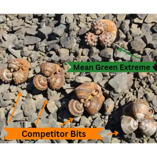 Mean Green is a top of the line bit that has proven itself more durable than its competitors, as exemplified by the image to the left. On the same tough run that competitor bits were only getting 60 - 150 feet on, the Mean Green Extreme went hundreds of feet, finishing the shot. Mean Green Extreme accomplished what four lower bits couldn't even get halfway through, and came out looking better than all the previous bits. When competitor bits fail, Mean Green rises to the occasion to get the tough shots done. Why practice with low quality bits, when you can get a much more reliable bit at a comparable price?
